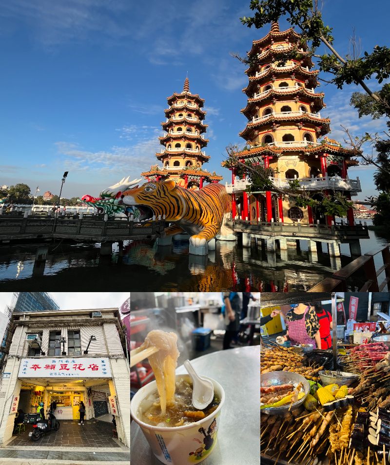 上:高雄の龍虎塔 左下:豆花のお店、真ん中:屏東の屋台にて 右下:六合夜市の屋台