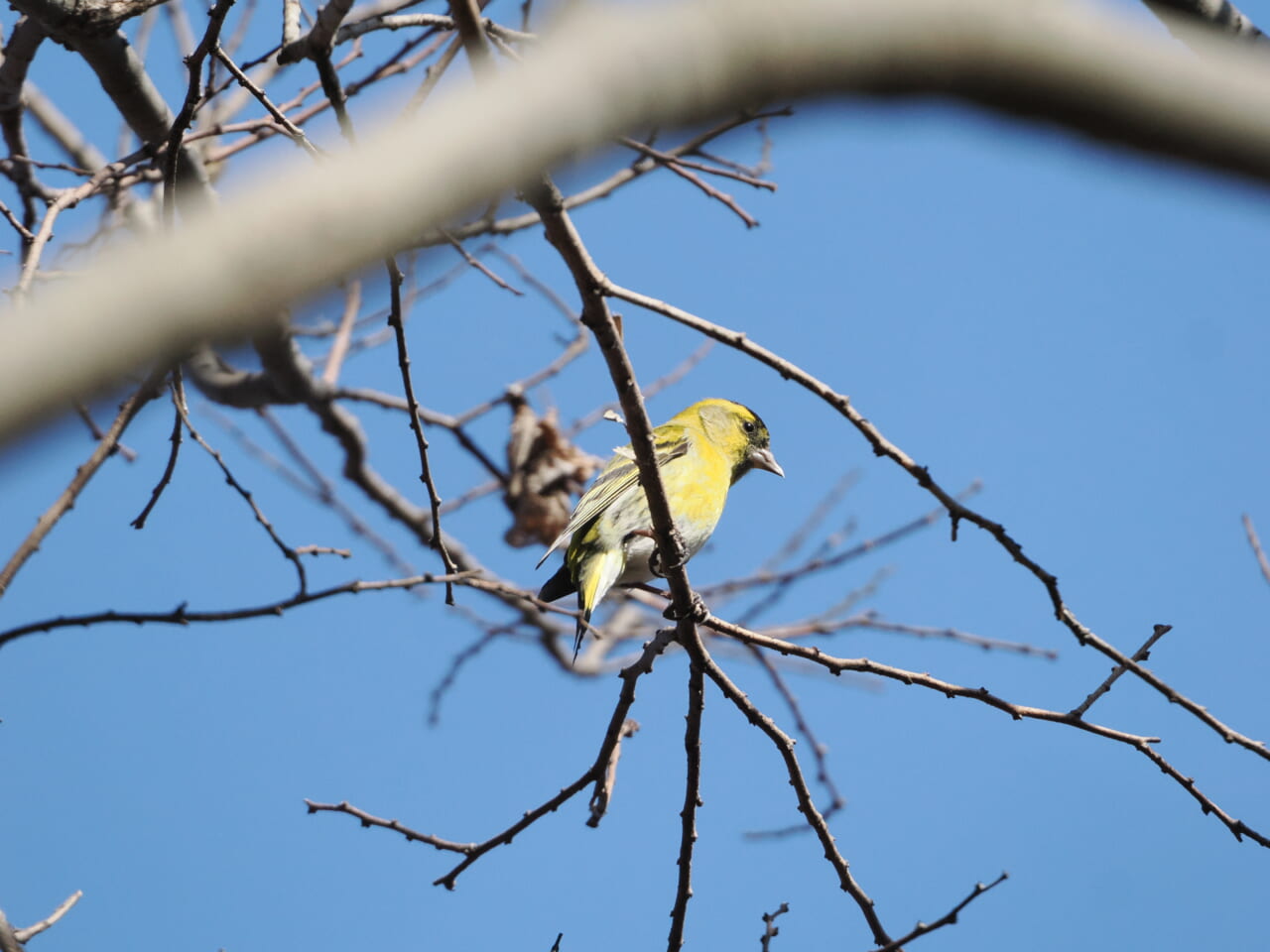 その後、水が少なくなった池に1羽のマヒワが降りてきます。周囲の樹をよく観察してみるとマヒワの群れがいるようです。スコープで枝のすき間から観察しているとすぐ近くの樹に群れでやってきました。強風で揺れる枝に止まってしばらく採餌しながら動き回り飛んで行きました。
