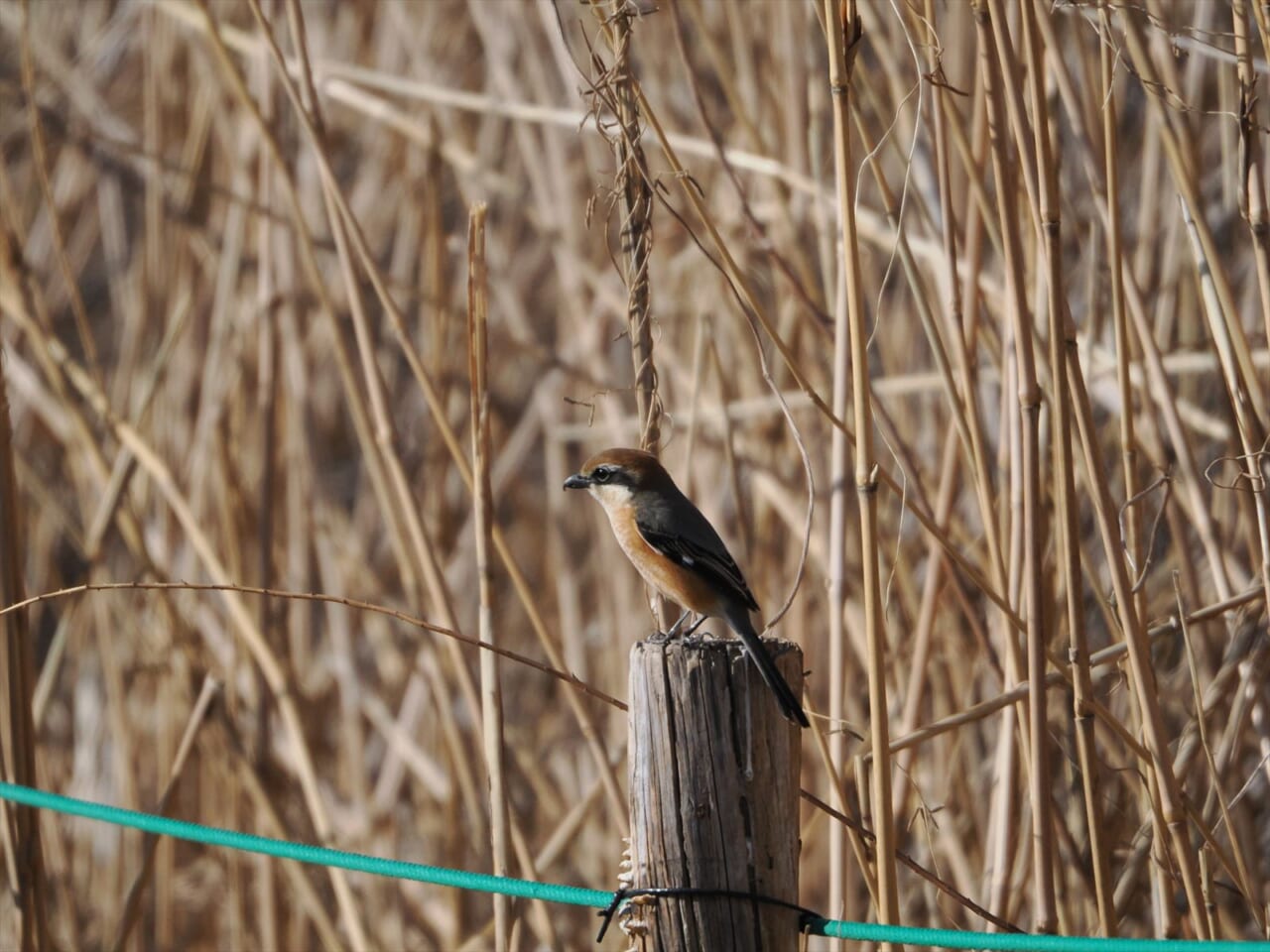 ヨシ原沿いの杭にモズが止まっています。