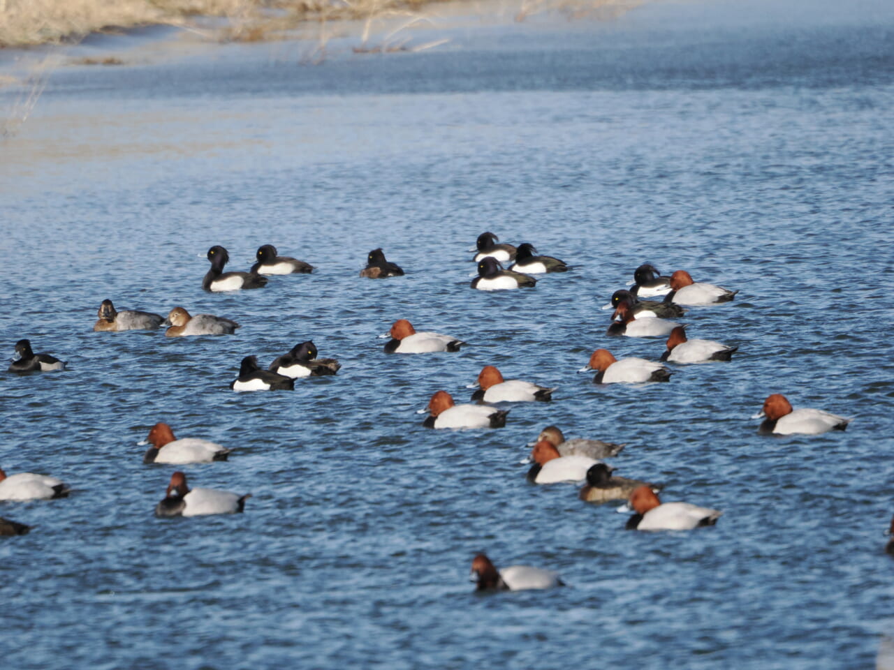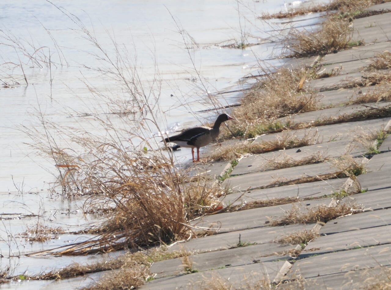 最後にバスで移動して彩湖へ。今年はなぜか1羽のカリガネがきています。伊豆沼でもマガンの群れに混じるカリガネを探すのに苦労しますからこちらも貴重な1羽です。前日は手前の芝生にいたらしいのですが、この日の強風を避ける他のホシハジロ等のカモ類と共に奥の岸辺あたりにいます。堤防の上からだと少し近くに見えるのではないかと行ってみると、他の何かに驚いたカモたちと共に反対側に移動してしまいました。