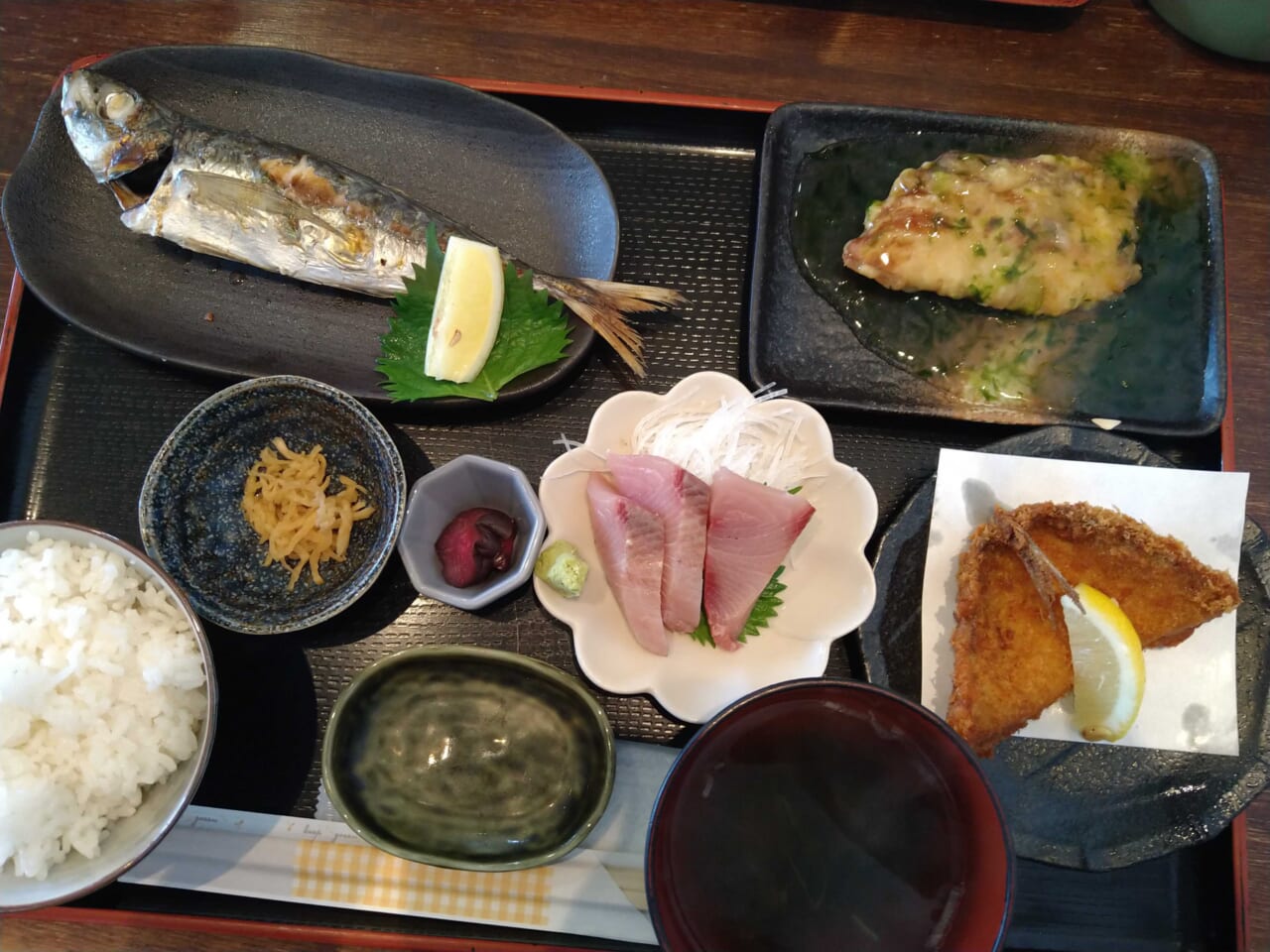 6種の刺身と目アジフライがついた完売必至の「刺身定食」(2,620円)は他の方に譲って、今回はマアジの塩焼きやヒラマサの天ぷらwith生のりあんかけ、刺身等の「港御膳」(みなとごぜん・2,420円)をいただきました。