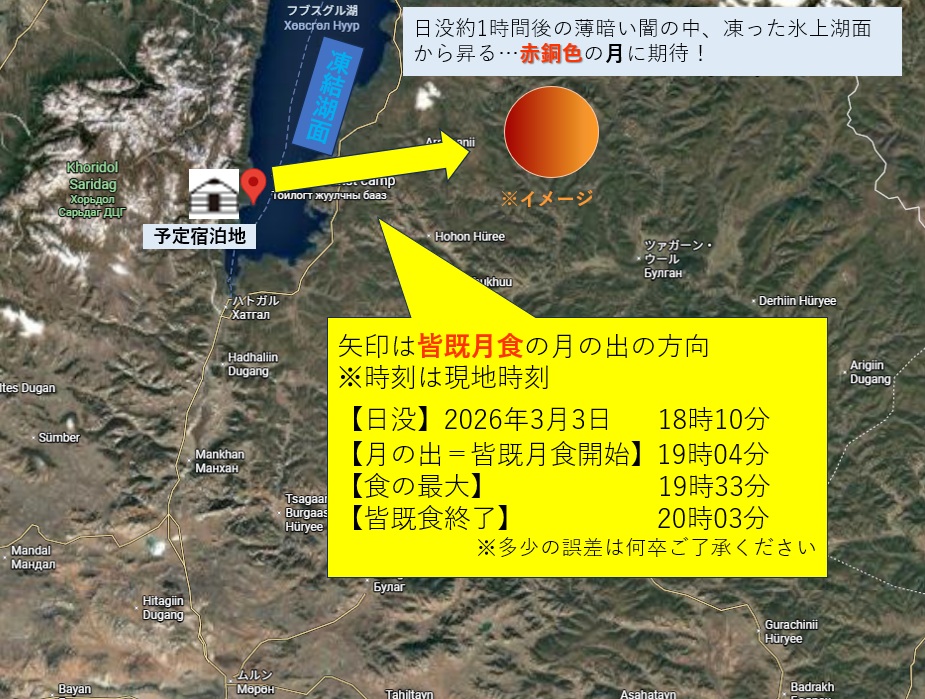 なんと、ツアー中の2026年3月3日夜が皆既月食と重なり日没後に凍結した湖面から昇る、赤銅色の月が見られるチャンスがあるのです!