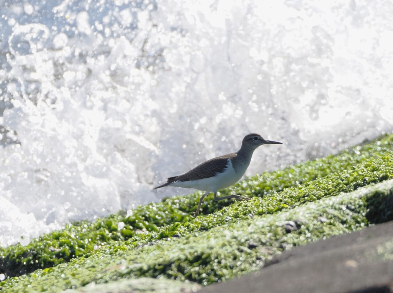 河口に近くなるとスズガモの群れがいます。イソシギが護岸で餌を探しています。