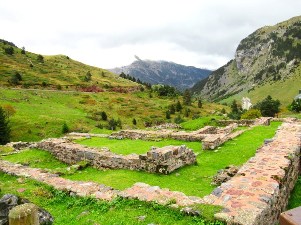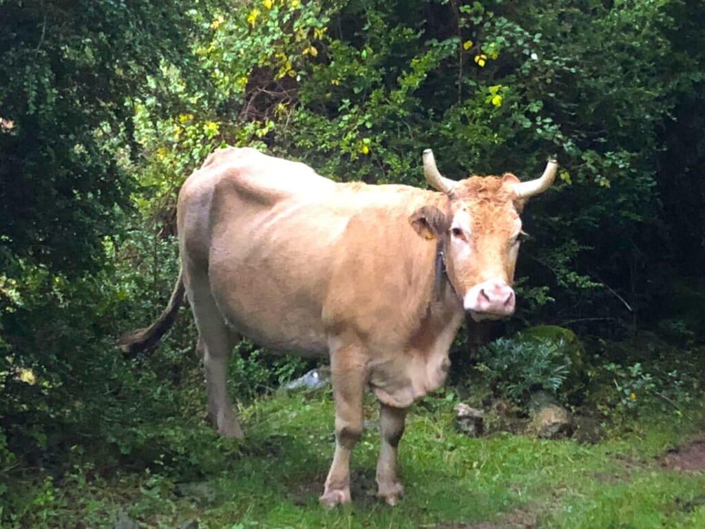 ルート上では放牧中の牛に出くわすことも「アラゴンの道ハイキング」はフランス国境のソンボルト峠からスタートします。現在のサンティアゴ巡礼路は車も往来する一般道になっている区間も多くなっていますが、このルートは昔ながらの道が多く残っていて、その当時の面影を感じながら巡礼路歩きが出来ます。峠からスタートするため、ピレネーの景観も楽しめ、大自然の中を歩きながら進みます。道は黄色い矢印マークが要所要所にあるので迷う事はありません。石畳の道、牧草道などを進み、周りには山や渓谷の風景が広がります。道の途中にはかつての巡礼者の為の病院跡の遺跡もあり、当時の面影をより感じられます。また時折、放牧中の牛とも道の真ん中で出会ったりと、歴史と自然を感じながら歩くこと約3時間、「アラゴンの道ハイキング」のゴール地点カンフランへ到着します。