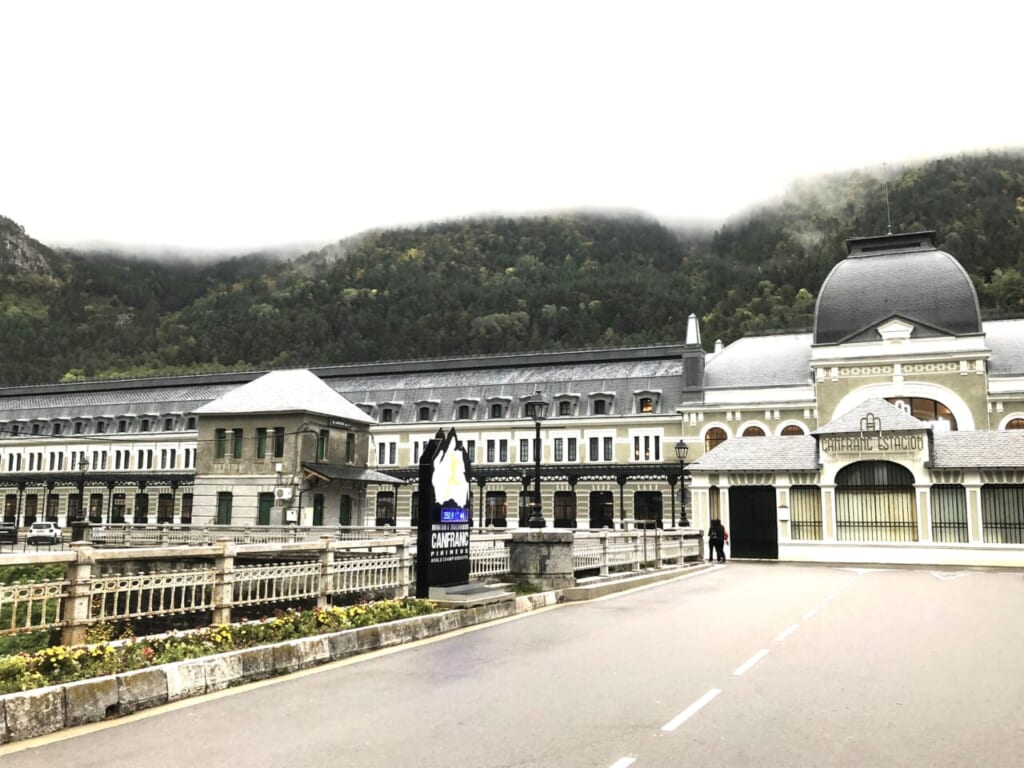 カンフラン駅舎ホテルに着いたらハイキングのゴール巡礼路ハイキングのゴール・カンフランにはかつてフランスとスペインを繋ぐ重要な要所てしてカンフラン国際駅がありました。ピレネー山脈を越えて人や物資が行き交う重要な駅でしたが1970年のフランス側の鉄橋事故をきっかけに廃線となりスペインのローカル駅のまま廃れていきました。しかし、2023年に古い駅舎を5星ホテルに改築、駅舎は240メートルもあり、横に長いのが特徴的で、当時の駅舎の面影は残しつつ、5星ホテルらしく豪華な雰囲気です。スペイン国内はもちろん海外からも多くの観光客を呼び込み活気を取り戻しています。