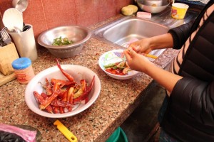 エマダツィ作り。まずはブータン唐辛子をちぎります エマダツィ作り。まずはブータン唐辛子をちぎります