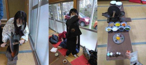 今回は、わが社のツアーや講座に数多く参加されている後町せつ子さんとその娘さんが申し込んでくれた。娘さん(陽子さん)は初めてだが、せつ子さんは慣れたもので、手際もよい。西さんが作業用にと用意してくれた黒の派手な羽織を着こんで、作業している様子は深川の粋な辰巳芸者のようであった。講座終了後、後町さんからメールが届いた。「…お疲れ様でした。お昼のとき、村の方々が作ってくれた、野菜のおかずがとてもおいしくて、みなさんの優しさをかんじました。ありがたいことですね。地元の産物で七味唐辛子を作るなんて、なかなかできることではありません。貴重な体験です。ありがとうございました。」と。このくすり塾の講座の昼時には、おばさまたちがいつもつくってくれる漬物や煮物、季節の果物などが出てくる。これが美味しくて、お腹いっぱいになる。
