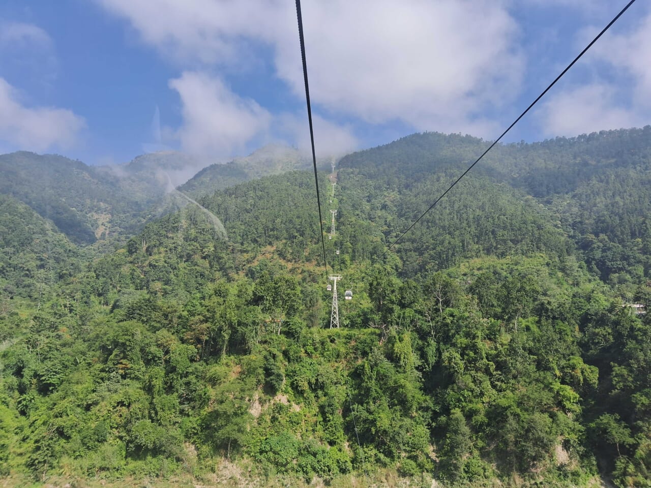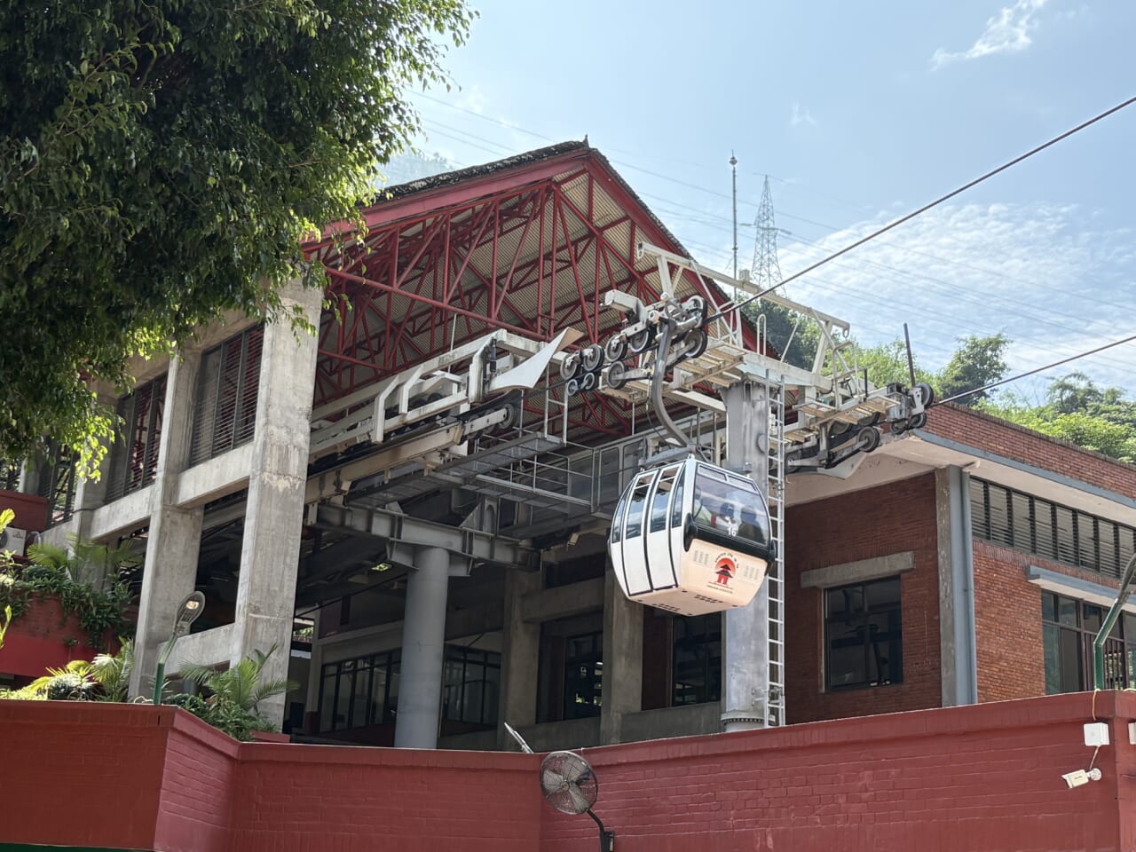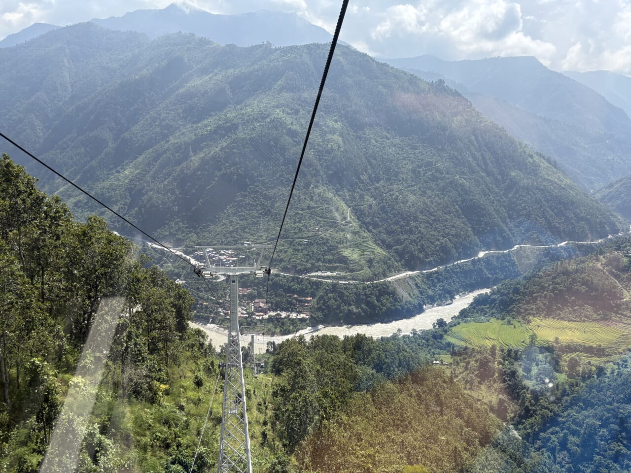 寺院へは、麓の村からケーブルカーに乗ってアクセスします。このケーブルカーは1998年に設置されたもので、標高差およそ1,000mを僅か10分ほどで駆け上がる本格的なもの。驚くべきはそのクオリティで、ヨーロッパ・アルプスの設備にも引けを取らないしっかりとした造りだと感じました。ケーブルカーからは、トゥリスリ川やゴルカ渓谷を一望でき、眺めが良く空中を散歩しているようです。さらに面白いのは、ケーブルカーが「人間用」と「生贄用(主にヤギ)」で別れていること。