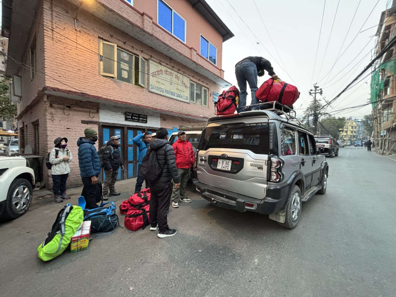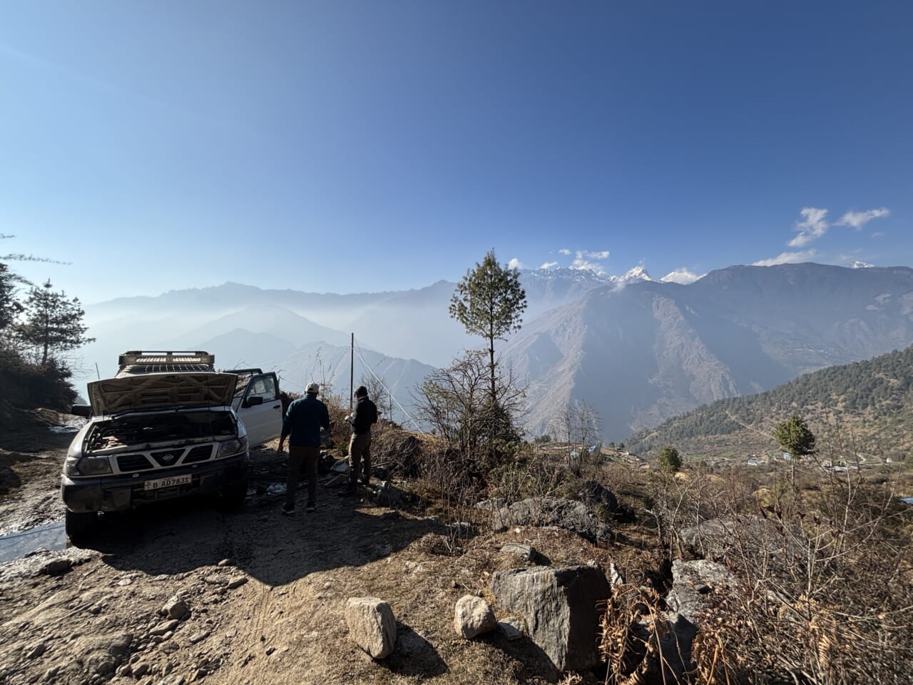 翌朝は早起きしてジープ移動。ダッフルバッグを車上の荷台に積み込み、約7時間かけて山の奥へ進みます。道中は揺れもありますが、段々畑や小さな村、谷の景色など、車窓からの眺めも楽しい時間です。途中ジープの1台がオーバーヒート。車の外でにでると、早速ヒマラヤの絶景が目の前に!思わぬ休憩で出会った風景にテンションがあがりました。