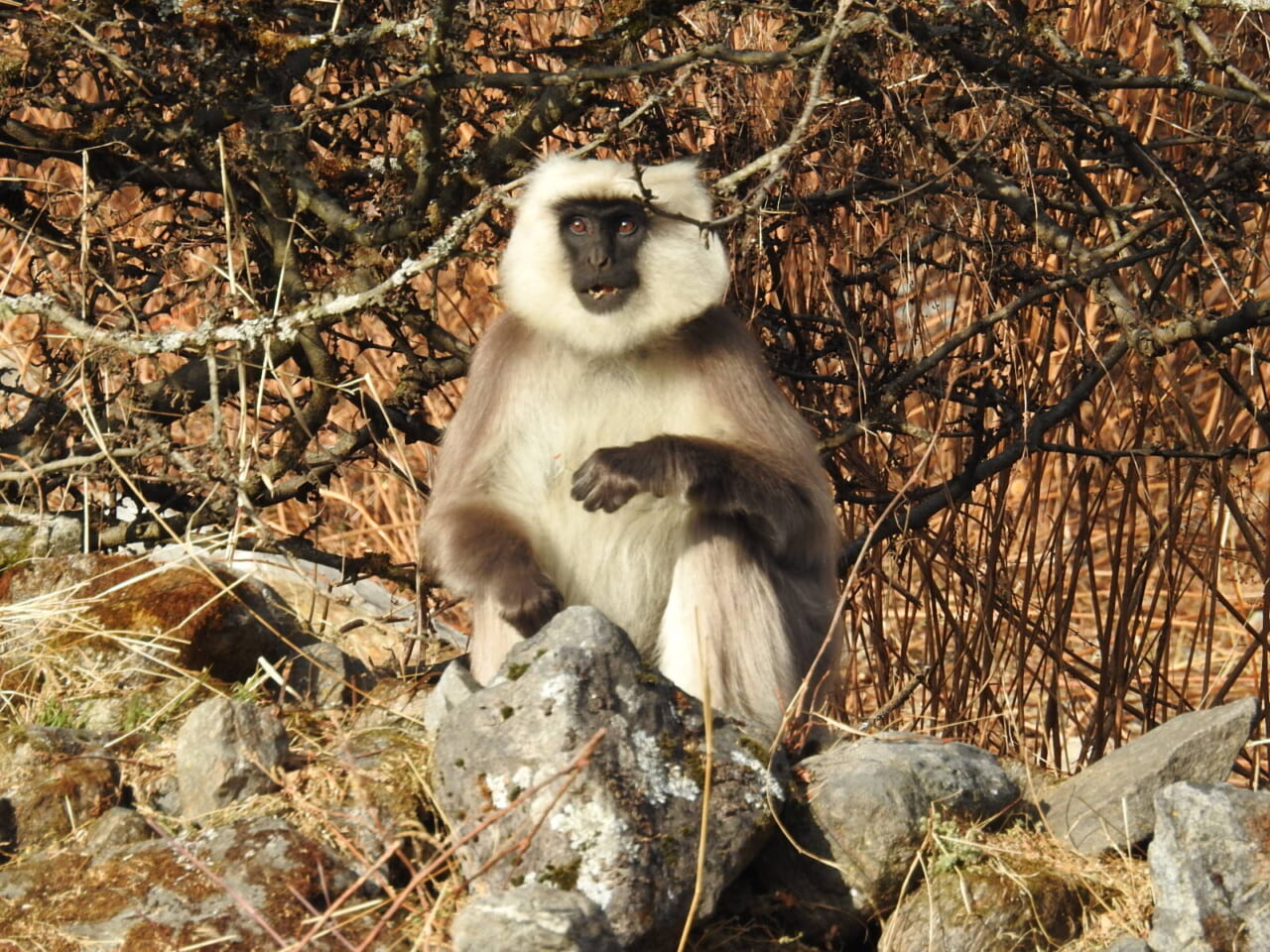 この日は森の中を歩く一日。樹林帯の中を、ゆるやかなアップダウンを繰り返しながら進みます。歩き始めてすぐに現れたのが、ヒマラヤラングール(サル)。最初は1匹見つけるたびに歓声が上がっていましたが、気づけば次から次へと登場し、木々がサルだらけに。まるでクリスマスツリーのオーナメントのような光景に、思わず笑ってしまいました。