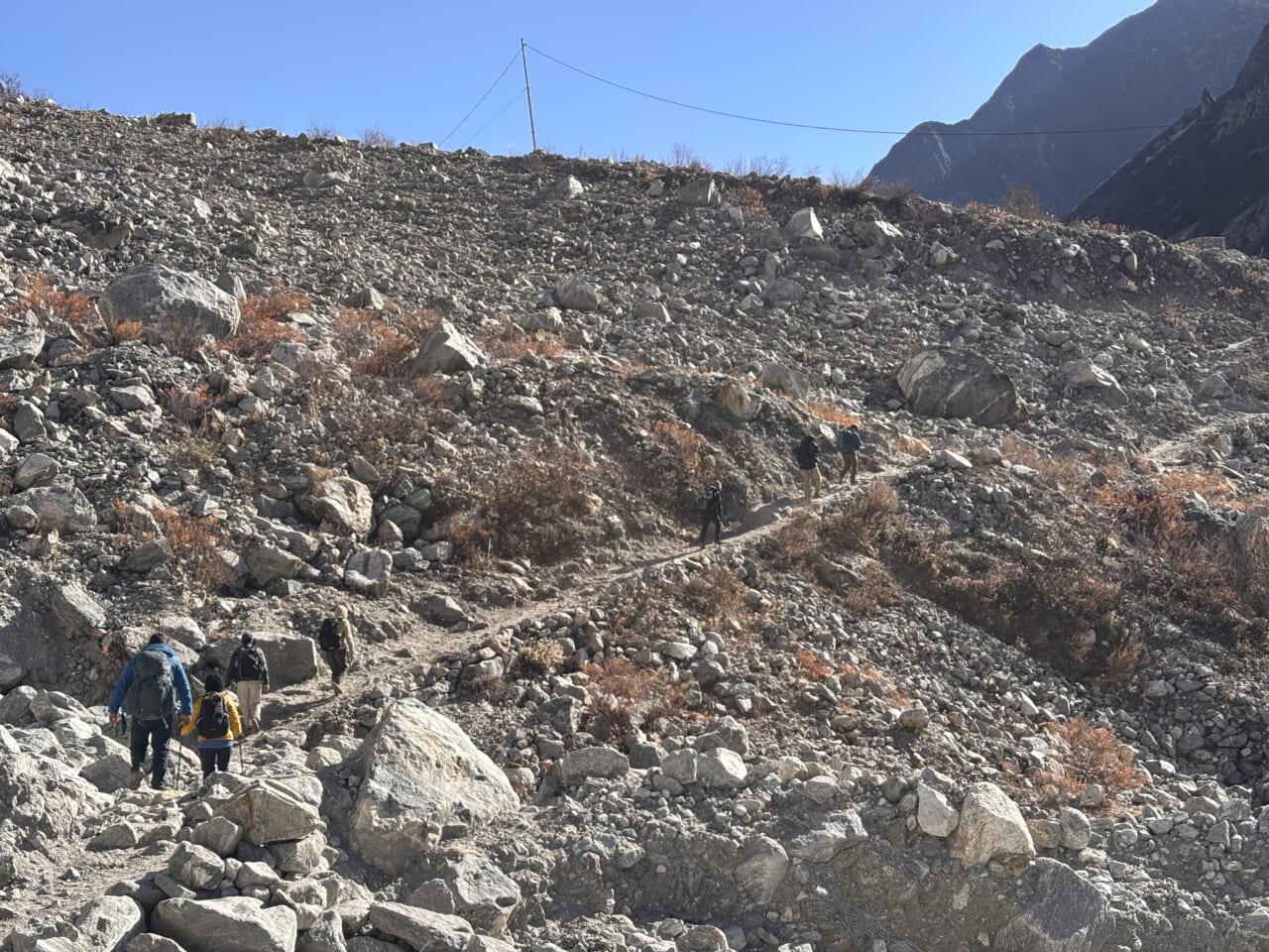 この日は、2015年のネパール大地震で大きな被害を受けたランタン村を通ります。雪崩と土砂により、当時の村はほぼ壊滅してしまい、多くの命が失われました。300名以上の村人、たまたま村に居合わせた外国人トレッカー、軍人、など正確な被害者数は分からないそう。がれ場となった旧村付近を歩きながら、自然の厳しさや、ここで暮らしていた人々のことなど、いろいろな思いが胸に浮かびます。