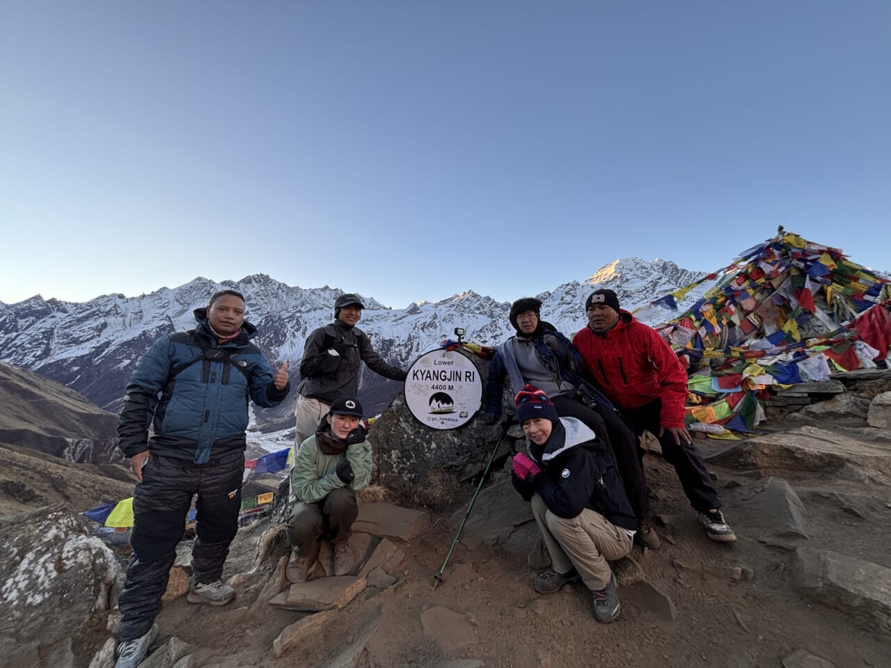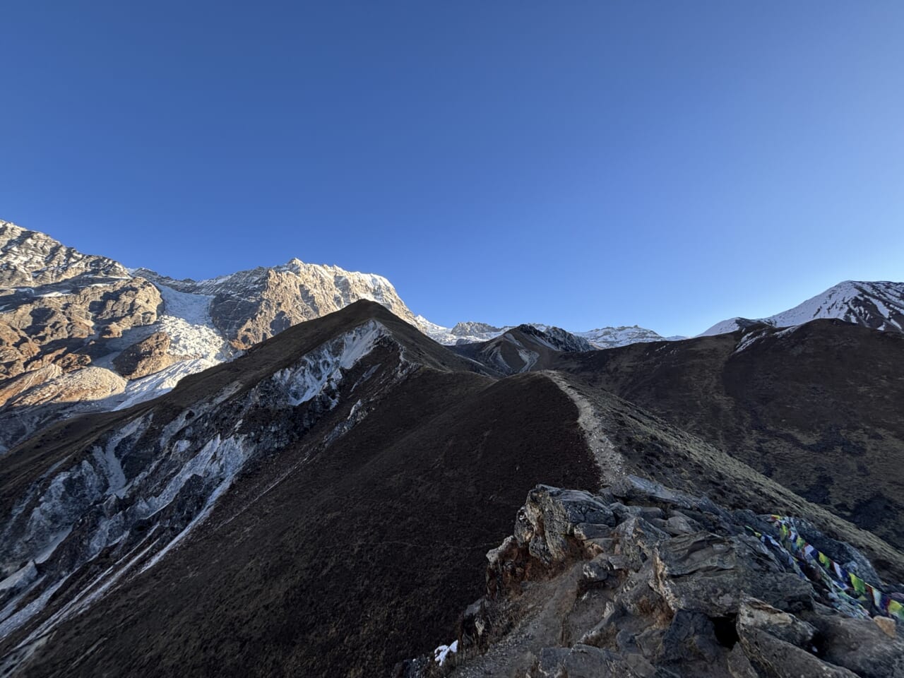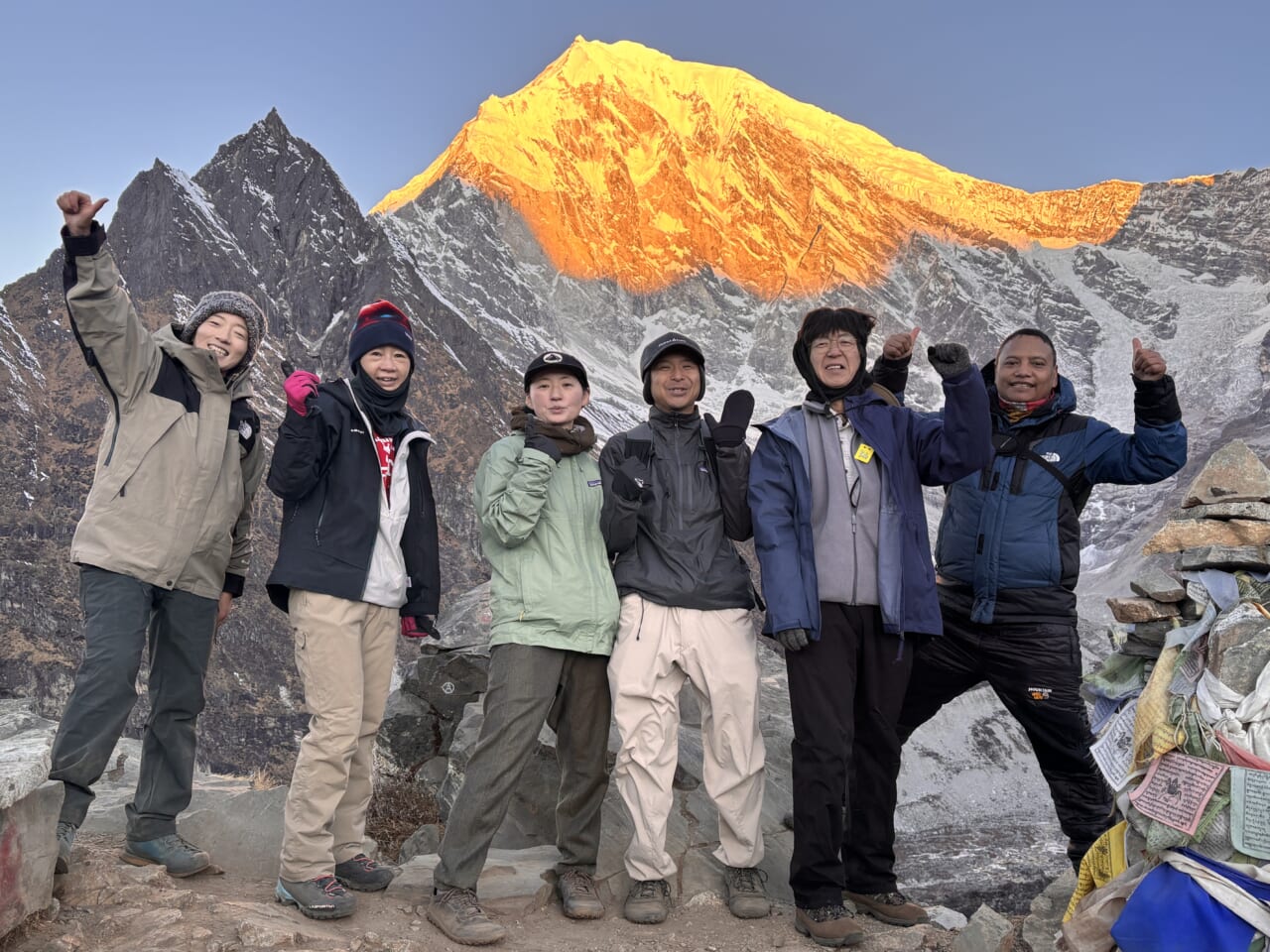 さらに登った先、キャンジンリ山頂からの景色はまさに圧巻。ランタンリルン(7,227m)をはじめとする山々が一望でき、「頑張って登ってよかった!」と誰もが思える大展望でした。