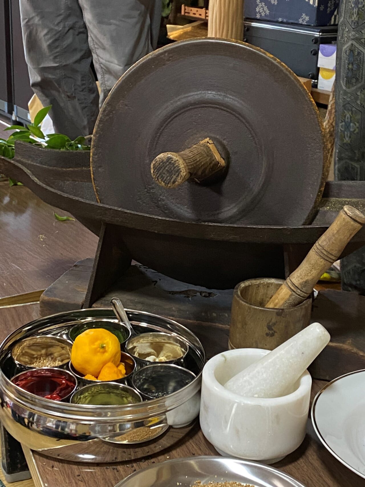 ただ薬研は見た目こそ重々しくて頼りがいがあるが、薬草の調整に関してはけっして万能なわけではない。固い実ならば石で直接たたいた方がいいし、葉っぱならば手で細かくした方がいい。森のくすり塾では主に平たい石臼を用いている。ヨモギ、陳皮、唐辛子などおおよそのものは平臼で事足りるため薬研の出番はほとんどないのが実情であり、結局は店内のインテリアとして落ち着いてしまっている。