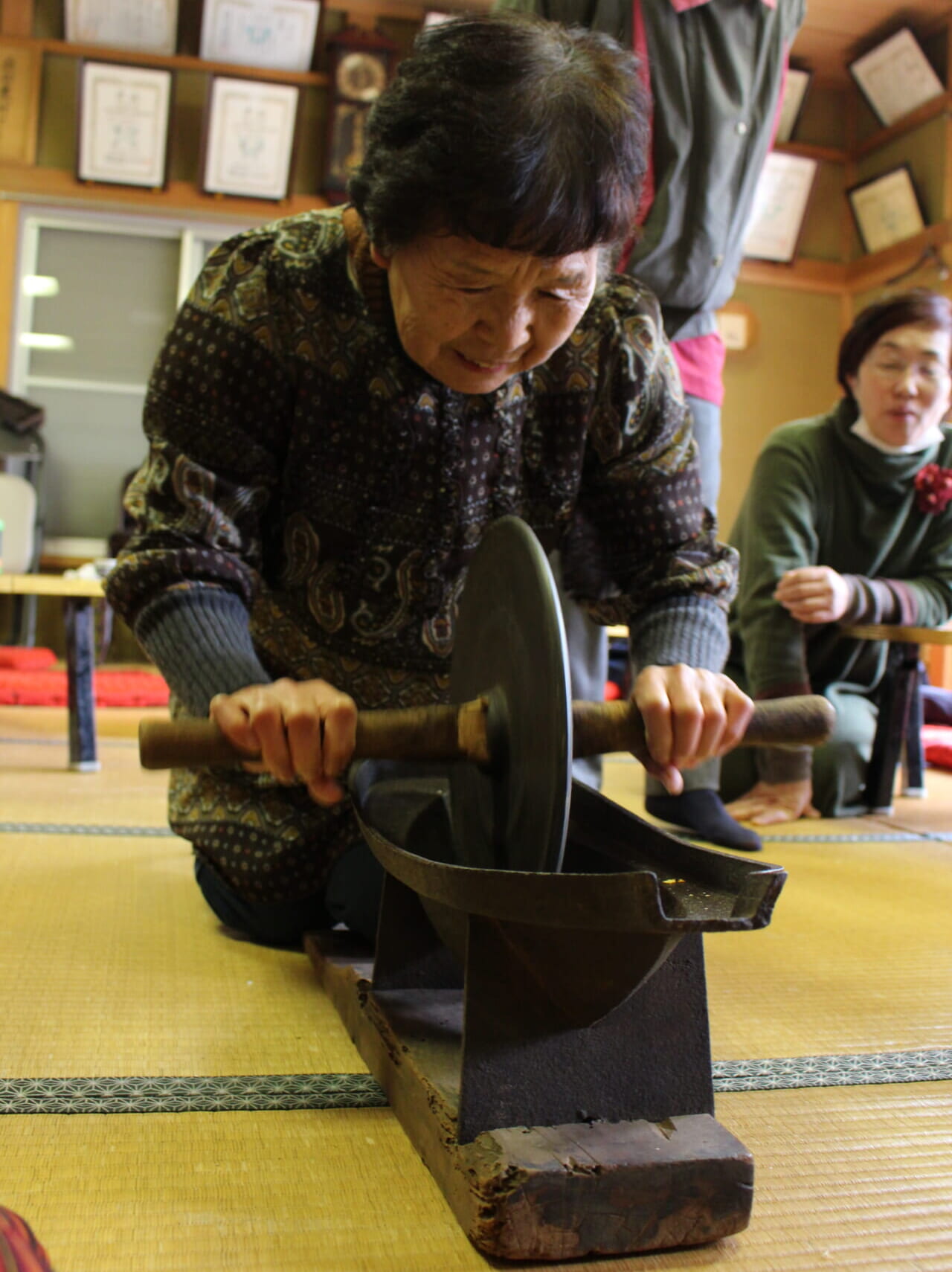 そこで、薬研の復権のために七味唐辛子作りをやってみよう、と「暮らしのくすり塾」で提案したのは2016年のこと。すると東秩父村地域おこし協力隊(当時)の西沙耶香さんは僕の想像以上に期待に応えてくれた。骨董市で立派な薬研を仕入れるとグラインダーで骨董品の薬研を磨いて見事に現役へと復活させたのである。そして西さんは我が子のように薬研を愛して使いこなし、1年後には東秩父産の原料を用いた「薬研挽き七味唐辛子」としてオリジナル商品の販売をはじめた。陳皮(福来みかん皮)や唐辛子、生姜など、西さんの手さばきを見ていると、薬を「研ぐ」という感じがリアルに伝わってくる。けっして、ゴリゴリと往復運動をするのではなく横の土手にあたる曲面を上手に利用しながら、まさに「薬」を「研」いでいる。電動ミルで一瞬にして粉砕するのとでは香りが明らかに違うし、香りの保持期間が長い。つまり薬研がいちばん本領を発揮するのは七味唐辛子を調整するときだといえる。