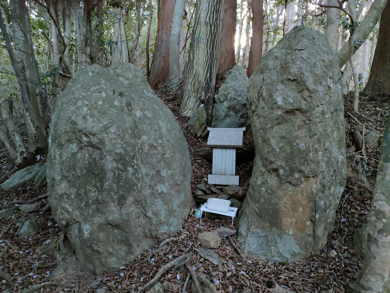 神山町鬼籠野(おろの)の山中に鎮座するもうひとつの立岩神社。この神社は名西郡神山町鬼籠野元山に鎮座しています。入口の鳥居から山道に入り、200mほど奥に進むと小さな社殿があります。社殿の背後に巨大な磐座があり、これがご神体の天岩戸とされます。巨大な磐座の中央には縦の亀裂が走り、女性の象徴と目される陰石のようにも見えます。スサノオの乱暴に怒った太陽神であるアマテラスが天岩戸に隠れると高天原は闇に閉ざされ、神々が知恵を絞って、再びアマテラスを岩戸から導き出した天岩戸隠れの聖地とされていますが、実際は雨乞い祈祷の聖地であったとも考えられています。