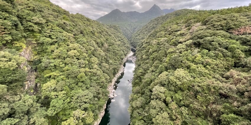 屋久島の特徴、深いV字渓谷にかかる橋から屋久島の山と川を望みます。