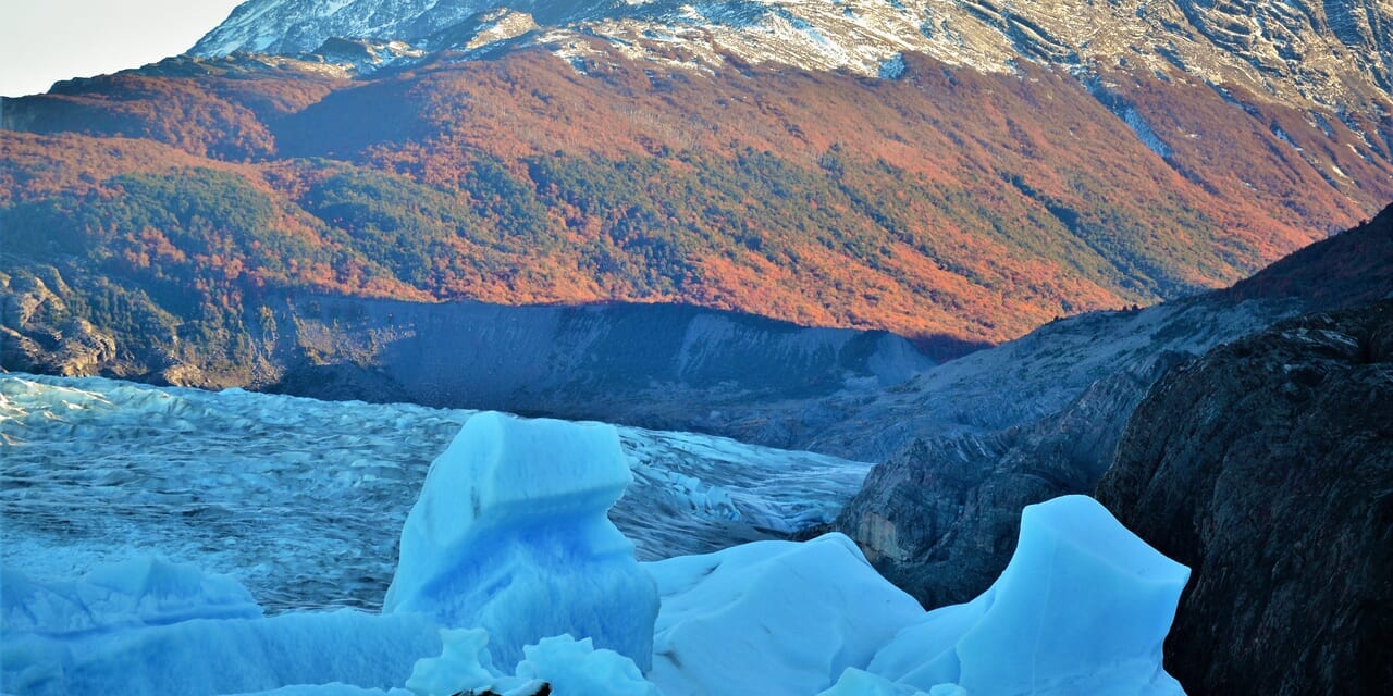 終日:ペリトモレノ氷河観光へ。カラファテを過ぎコバルトブルーに輝くアルヘンティーノ湖の眺めを楽しみながら、ペリトモレノ氷河へ到着。ボートと展望台の両方から青く輝く巨大な氷河をお楽しみ下さい。また、この時期は黄色、オレンジ、赤などに染まった南極ブナと青く輝くペリトモレノ氷河とのコントラストも楽しめます。
